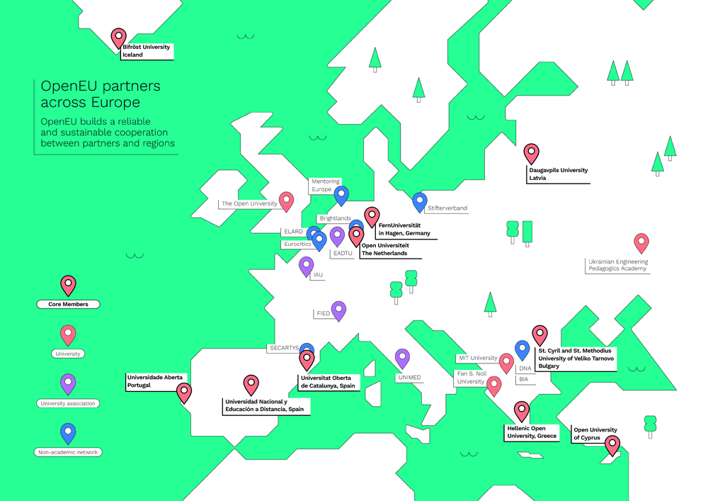 The OpenEU alliance brings together ten universities and other non-university institutions from across Europe with the aim of creating an inclusive, digital, and sustainable educational landscape. Drawing on its many years of experience, the FernUniversität contributes to the development of innovative teaching and learning formats, networking research, and preparing new mobility offers.