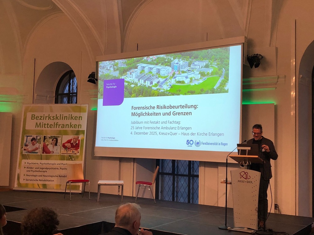Am 4. Dezember 2025 hat die Jubiläumsveranstaltung "25 Jahre Forensische Ambulanz Erlangen" stattgefunden. Anlässlich des Festakts hat Professor Mokros einen Vortrag zum Thema "Forensische Risikobeurteilung: Möglichkeiten und Grenzen" gehalten, in dem er neue meta-analytische Befunde vorgestellt hat. Forensisch-psychiatrische Ambulanzen sind für die Nachsorge psychisch kranker Rechtsbrecherinnen und Rechtsbrecher da. Wenn vormalige Forensik-Patientinnen und Patienten zur Bewährung entlassen werden oder die Unterbringung direkt zur Bewährung ausgesetzt wurde, übernehmen forensisch-psychiatrische Ambulanzen die Versorgung.