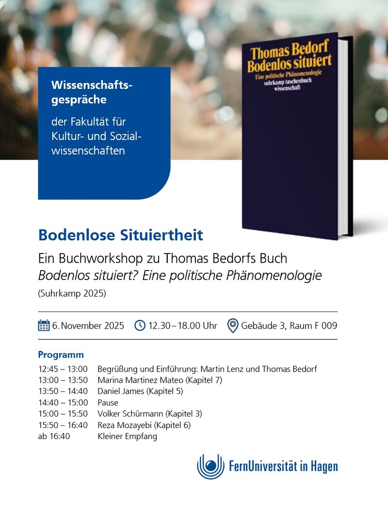 [16.10.2025]Am 6. November 2025 findet am Campus der Fernuniversität ein öffentlicher Buchworkshop statt, bei dem vier Experten Thomas Bedorfs neues Buch 'Bodenlos Situiert' gemeinsam mit dem Autoren diskutieren.
