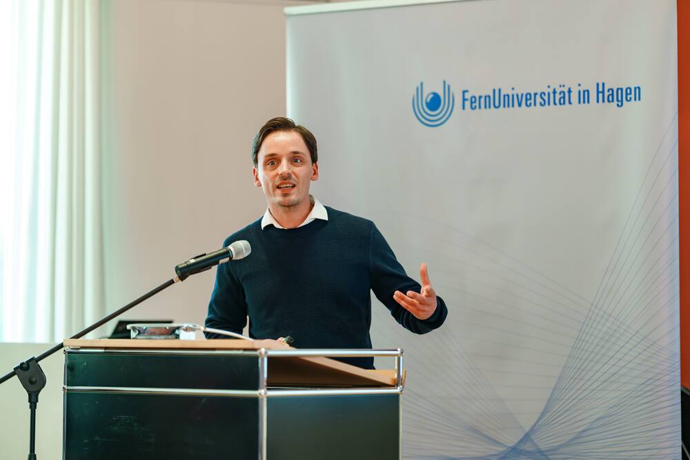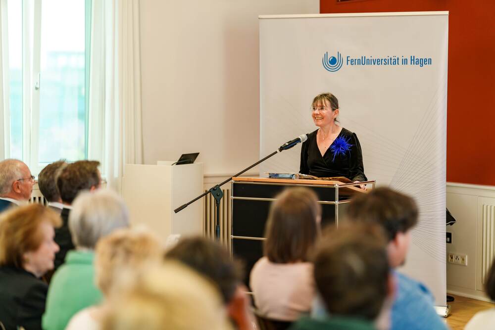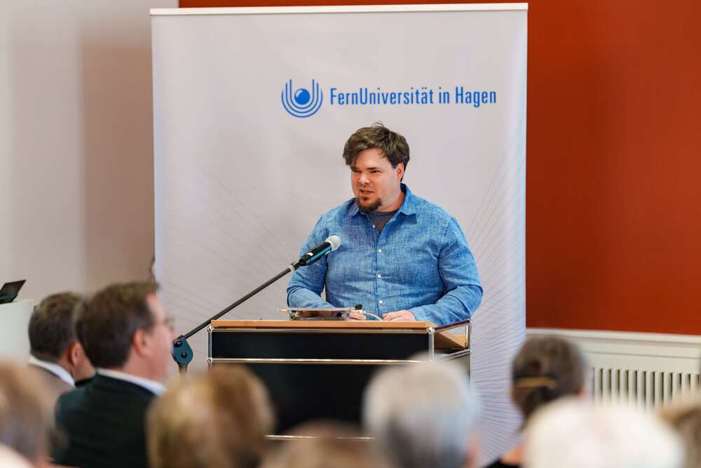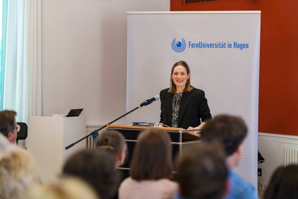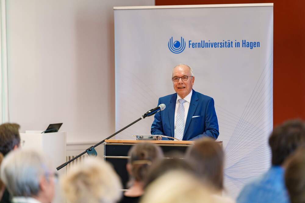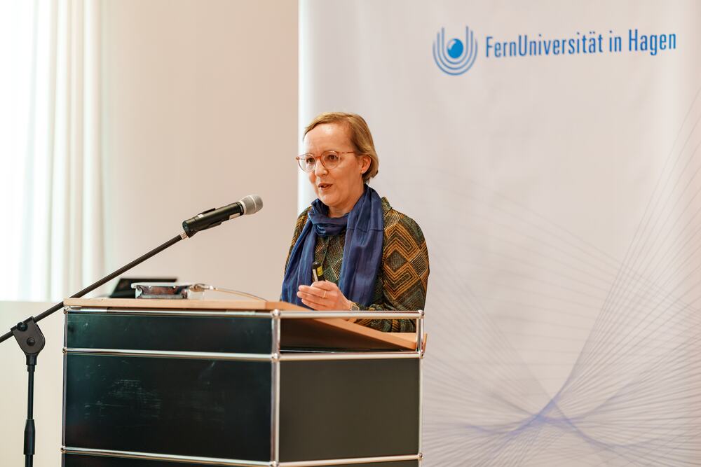 In seinem Grußwort würdigte Prof. Dr. Stefan Stürmer, Rektor der FernUniversität in Hagen, das Engagement der Unternehmerfamilie und der Ernsting Kunst- und Kulturstiftung ausdrücklich als herausragenden Beitrag zur langfristigen Sicherung exzellenter Forschung und zum Wissenstransfer in die Gesellschaft: