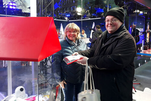 Anna Appelhagen und Dr. Patric Albrecht haben sich gestern auf den Weg nach Essen zum WDR-Weihnachtswunder gemacht – zur Spendenübergabe. 2556 Euro hatten die FernUni-Beschäftigten beim Weihnachtsmarkt gesammelt und gespendet.