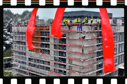 Nanu, was passiert denn gerade am Gebäude 11? Sind das etwa rote Geschenkbänder? Oder risKIert* hier jemand noch ein Großprojekt so kurz vor Jahresschluss? Machen Sie sich selbst ein Bild – bzw. Video. Film ab!
