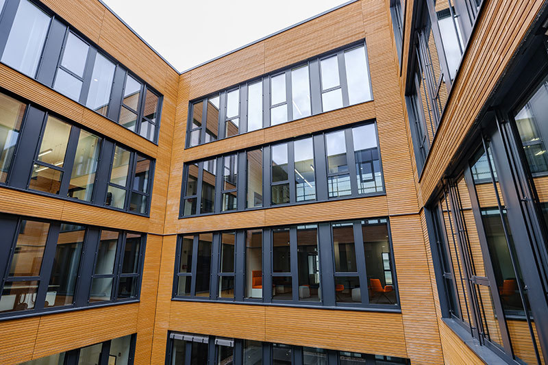Der nachhaltige Neubau ist fast fertig und wird Ende April eingeweiht. Aktuell ziehen der Zentralbereich und die 12 Lehrgebiete ein, die in Zukunft unter einem Dach arbeiten.