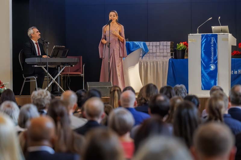 Dr. Matthias Wilde, Leiter des Campusstandorts, hob die besondere Stimmung unter den 100 Alumni und 250 Gästen hervor: „Eine Alumnifeier ist der große Abschluss des Studiums. An Abenden wie diesen sehe ich an den freudigen und entspannten Gesichtern, was unsere Absolventinnn und Absolventen geleistet haben.“ Für die musikalische Begleitung des Abends sorgten Aylén Bárbara Gerull (Sopran) und Mariano Siccardi (Klavier) mit spanischen Klängen und einer besonderen Atmosphäre.