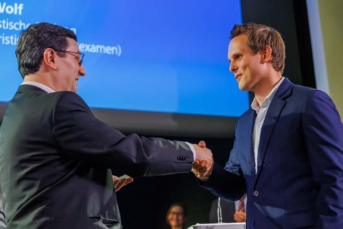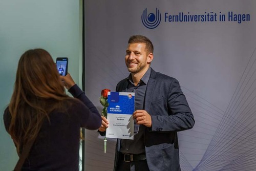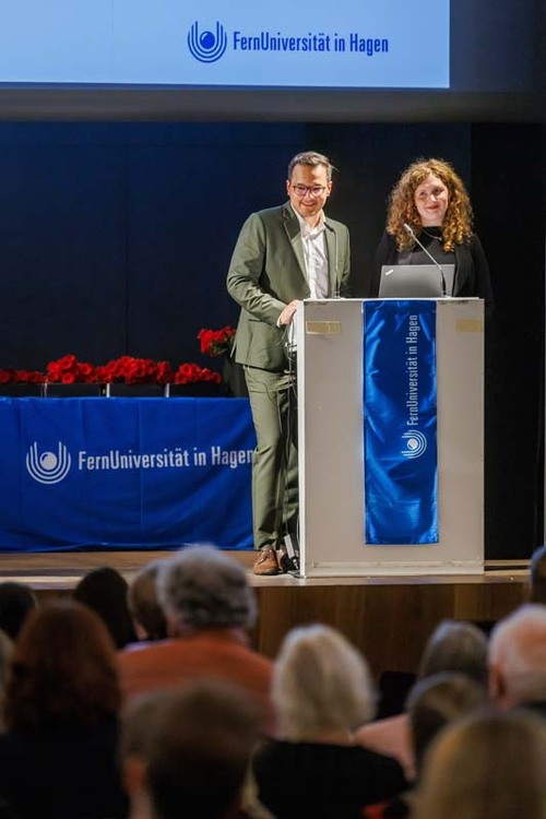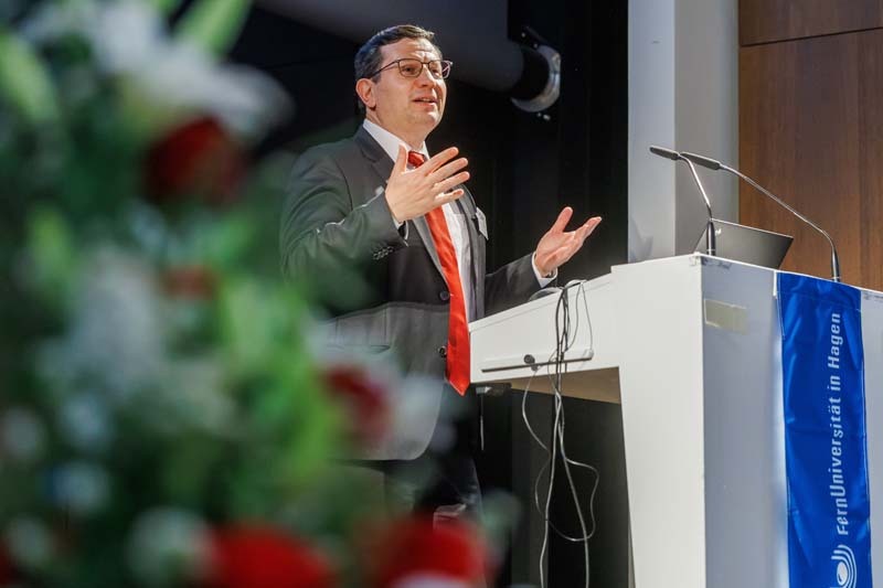 Für einen weiteren besonderen Moment sorgte Malte Wolf, Absolvent des Studiengangs Erste Juristische Prüfung. Wolf hat das Examen mit einem herausragenden Ergebnis abgeschlossen – eines der besten in ganz NRW und wurde dafür von Prof. Dr. Osman Isfen, Prorektor der FernUniversität, gelobt. Dieser hob in seiner Rede die Bedeutung von Neugier und Wissbegierde im Fernstudium hervor: „Erfolg entsteht dort, wo Engagement, Ausdauer und Leidenschaft aufeinandertreffen.“