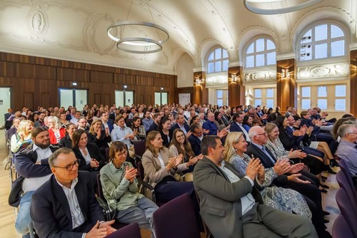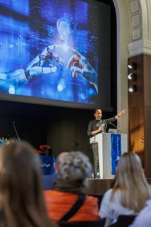 Impulse für die Arbeitswelt von morgen lieferte Prof. Dr. Till Winkler, wissenschaftlicher Berater am Campus Hamburg. In seinem Impulsvortrag „Die drei Ebenen erfolgreicher KI-Integration in den Arbeitsalltag“ zeigte er praxisnah, wie Künstliche Intelligenz das Lernen und Arbeiten verändern kann – von der individuellen Nutzung über Teamstrukturen bis hin zu strategischen Unternehmensentscheidungen. Mit einem Augenzwinkern machte er deutlich: „Was wir im Studium nicht geschafft haben, holen wir jetzt in zehn Minuten nach.“ Sein Vortrag verband Zukunftsperspektiven mit konkreten Beispielen aus dem Arbeitsalltag – und sorgte für angeregte Gespräche beim anschließenden Empfang.