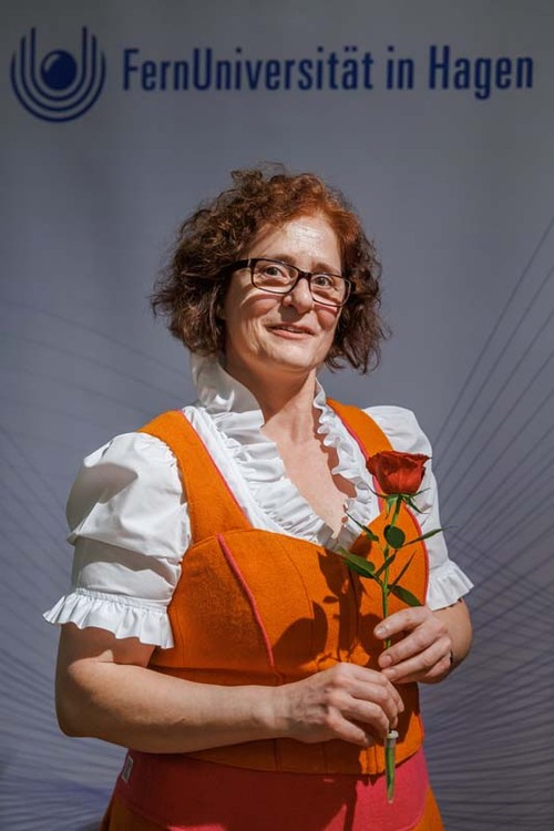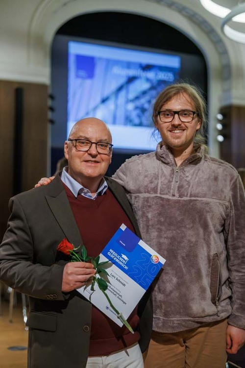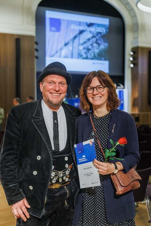 Staunen konnten die Gäste des Abends schließlich über ein weiteres Detail: Jörg Aldag vom Hamburger Absolvent:innenkreis trug eine echte FernUni-Krawatte aus den 1980er-Jahren. Das auffällige Accessoire wurden damals für besondere Verdienste vergeben – für Frauen gab es bunte Halstücher. Wer diese Ehrengaben alles erhalten hat, ist heute kaum noch zu rekonstruieren. Klar ist: Aldags Krawatte ist ein Stück FernUni-Geschichte – und diese Geschichte möchte er weitertragen. Er nutze die Gelegenheit, um die frisch gebackenen Alumni einzuladen, dem Hamburger Absolvent:innenkreis beizutreten: „Unser Netzwerk lebt vom Austausch. Wir bleiben verbunden – auch über das Studium hinaus.“