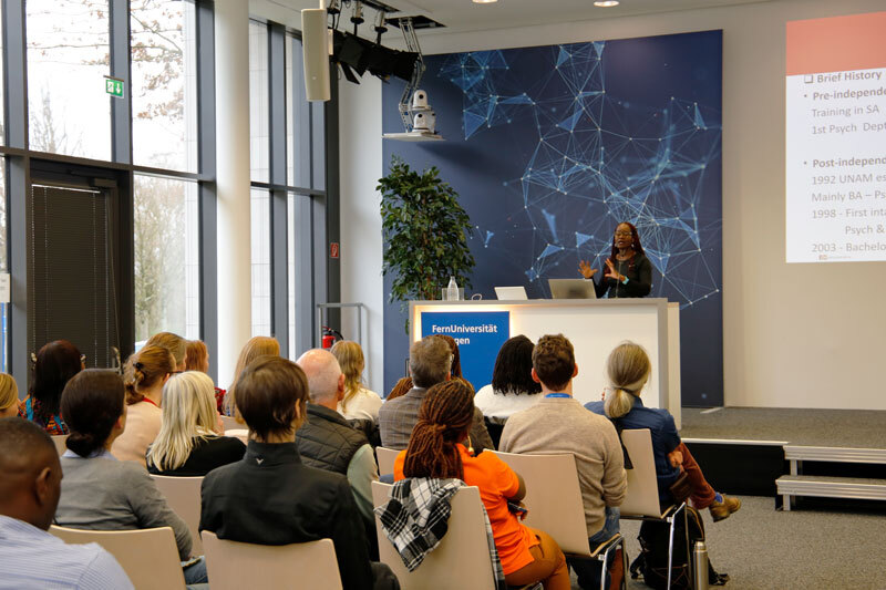 Am Tag der Forschung der Psychologie präsentierten die Studierenden die ersten Ergebnisse ihrer gemeinsamen Forschung: Erste Analysen zeigen, dass die Befragten in Deutschland und Namibia ähnliche Wahrnehmungen vieler klimabezogener Phänomene aufwiesen, Teilnehmende in Namibia jedoch ein stärkeres Bewusstsein für den Klimawandel aufwiesen. Auch die Mitarbeitenden der UNAM nutzten die Gelegenheit und stellten ihre Arbeit und die Universität vor. Dr. Manfred Janik gab einen Überblick über die University of Namibia und ihre verschiedenen Standorte. Dr. Elisabeth Shino, Dr. Clifford Hlatywayo und Dr. Annelisa Murangi stellten die Arbeit in ihrer Fakultät „Faculty of Education & Human Sciences“ vor und zeigten auf, vor welchen Herausforderungen sie stehen – wie auch an der FernUniversität gehört dazu unter anderem, dass verhältnismäßig wenige Beschäftigte viele Studierende betreuen müssen. Das Projekt „Psychology for Future“ hat zum Ziel, Lehrenden und Studierenden gleichermaßen eine Perspektive von Lehre und Forschung in Deutschland und Namibia zu vermitteln. Weiterhin sollen Synergieeffekte durch gemeinsame Lehrangebote und der Möglichkeit zu kollaborativer Forschung genutzt werden. Zum Projekt gehören regelmäßige Konferenzen und gegenseitige Austauschbesuche.