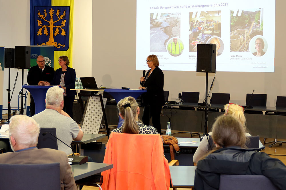 Für lokale Perspektiven und emotionale Momente sorgten Feuerwehr, Umweltamt und Wohlfahrtsverbände mit ihren Rückblicken auf das Starkregenereignis 2021. „Die schnelle, unkomplizierte Hilfe für die Betroffenen hatte für die Wohlfahrtsverbände höchste Priorität”, berichtete etwa Susanne Jakoby von der Hochwasserhilfe der AWO Hagen-Märkischer Kreis. „Bis heute stehen wir an der Seite der Betroffenen.”