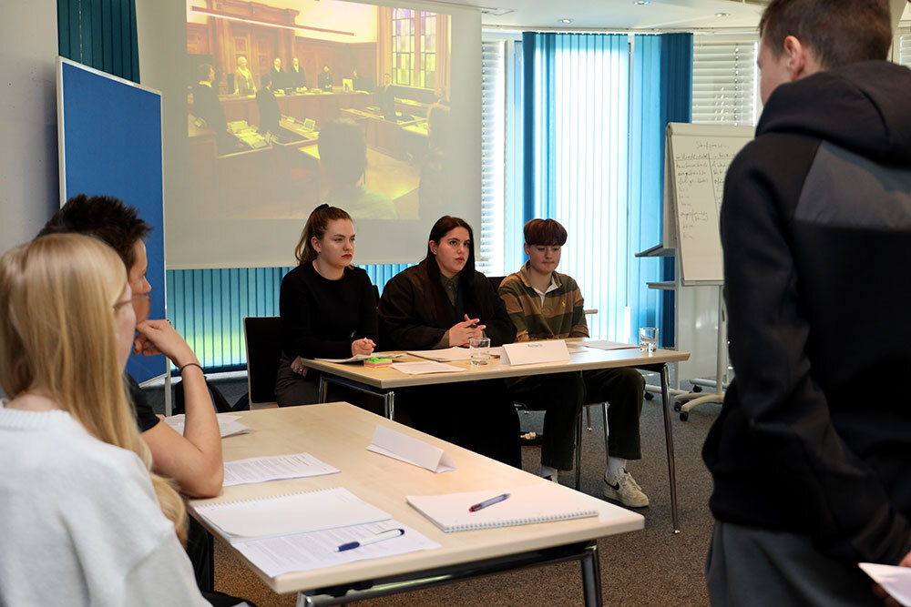 Merle Biedermann ist 18 Jahre alt und schlüpft im Rollenspiel in die Robe der Richterin. „Ich mache im nächsten Jahr mein Abitur und möchte danach Jura studieren“, sagt sie. „Es ist toll, dass wir hier echte Fälle besprechen und erfahren, wie die Urteile ausgefallen sind.“