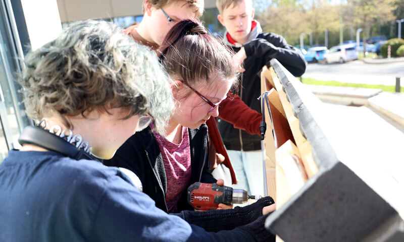Kopf wie Hand wurden beim Klima-Camp auf dem FernUni-Campus gefordert: Jugendliche ab 14 Jahren lernten hier nicht nur viel über die Energiewende, sondern bauten zusammen mit Partnern verschiedener Gewerke gleich selbst ihre eigenen Photovoltaikanlagen auf – vom Dachstuhl bis zur finalen Inbetriebnahme. Die Kreishandwerkerschaft Dortmund Hagen Lünen und die Agentur Mark kooperierten für das Angebot mit der FernUniversität.