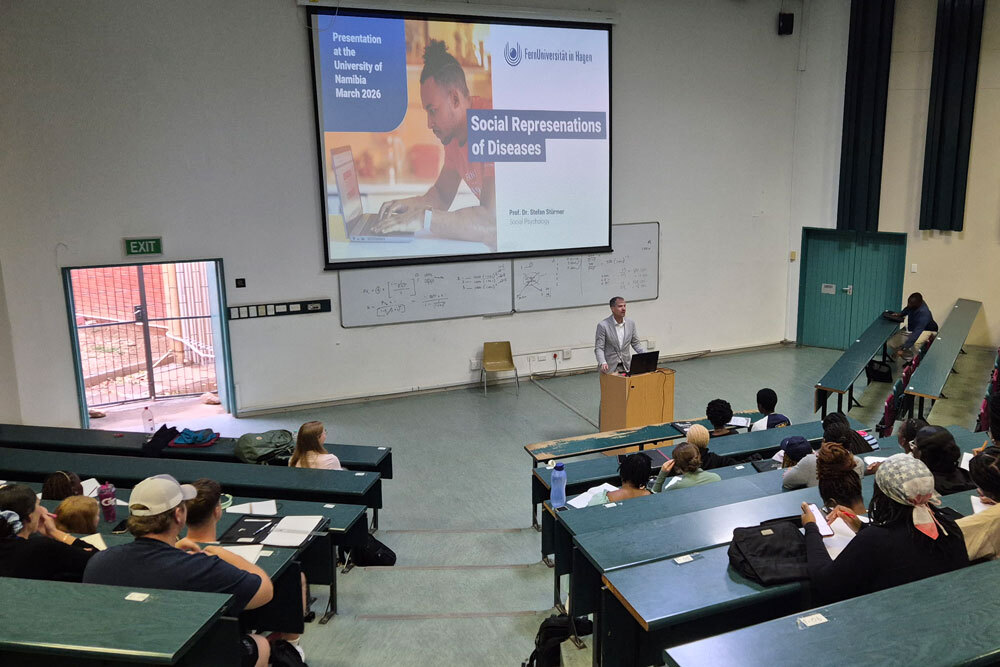 Immer mit dabei: Studierende beider Unis. In internationalen Teams arbeiteten sie an den gemeinsamen Projekten, lauschten Vorträgen und übten sich im Feedback. Eines von vielen Highlights war ein „Community-Engagement-Workshop“ mit Freiwilligen vor Ort. Hier konnten die Teilnehmenden psychologisches Wissen in einem realen Kontext zur praktischen Anwendung bringen. Thema: Psychologische Belastung und Stressbewältigung. „Das Community Engagement hat eindrucksvoll die hohe Qualität der Ausbildung unseres Bachelorstudiums in Psychologie gezeigt - und außerdem die Stärken unserer vielfältigen Studierendenschaft“, resümiert Rektor Prof. Dr. Stefan Stürmer. Weitere Perspektiven eröffnete der Kontakt mit institutionellen Partnern in Windhoek, etwa dem Goethe-Institut. Gesprächspunkte waren die Mobilität von Studierenden, die Abwanderung von Fachkräften („Brain Drain“) und berufliche Entwicklungschancen, insbesondere im Bereich der Sprachvermittlung und internationaler Arbeitsmärkte.