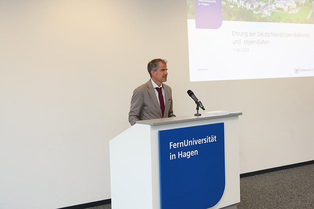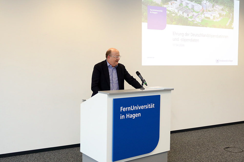 Auch Erik Höhne, Vorstandsvorsitzender der Gesellschaft der Freunde der FernUniversität (GdF), richtete anerkennende Worte an die Geförderten und war sich sicher, dass diese die Zukunft unserer Gesellschaft aktiv mitgestalten werden. „Wir freuen uns, Sie auf diesem Weg zu unterstützen."